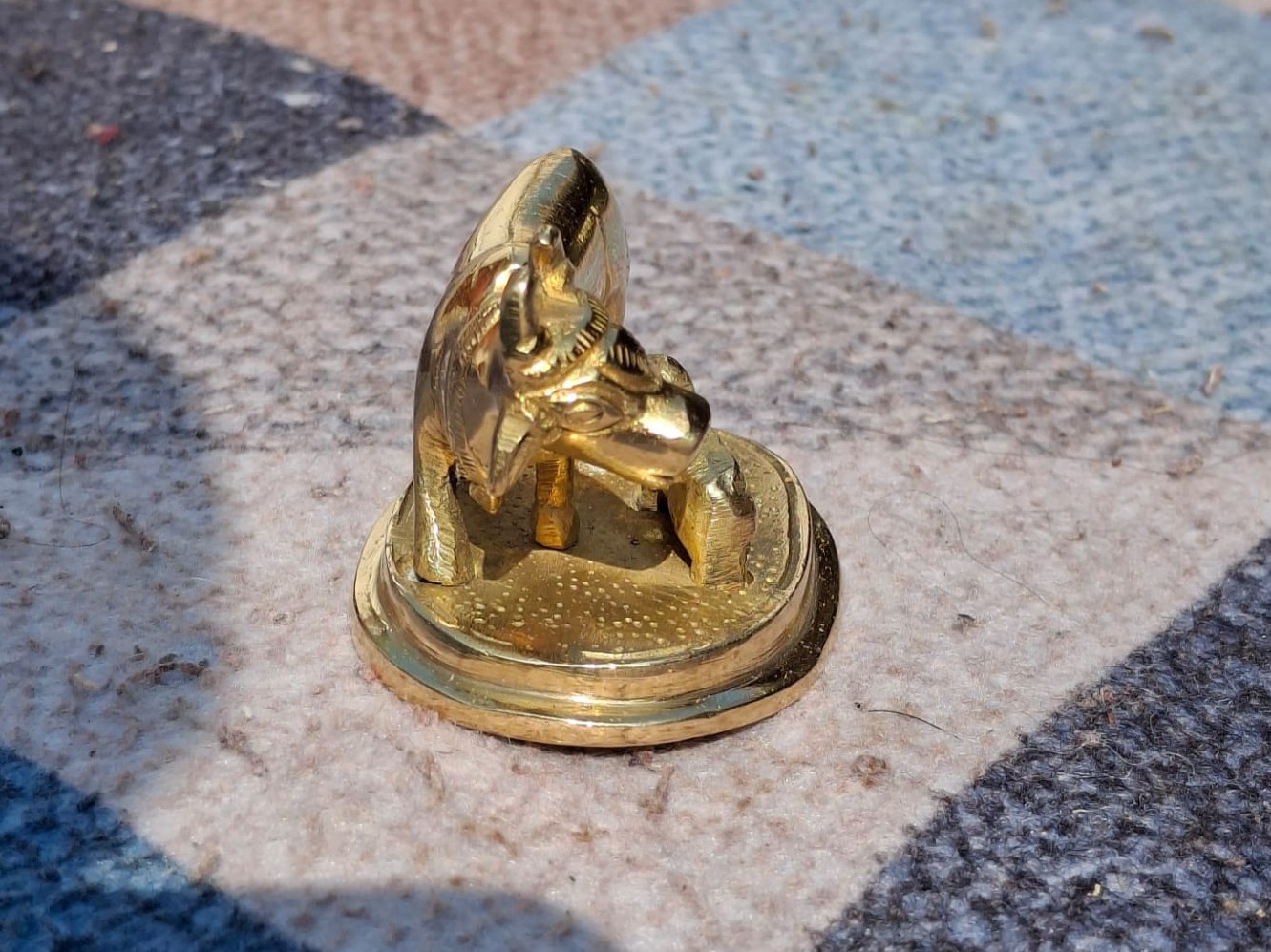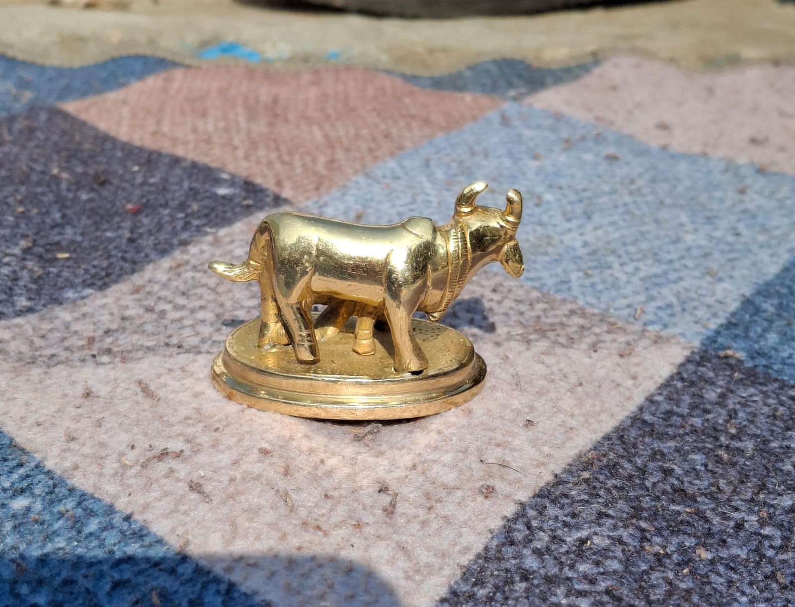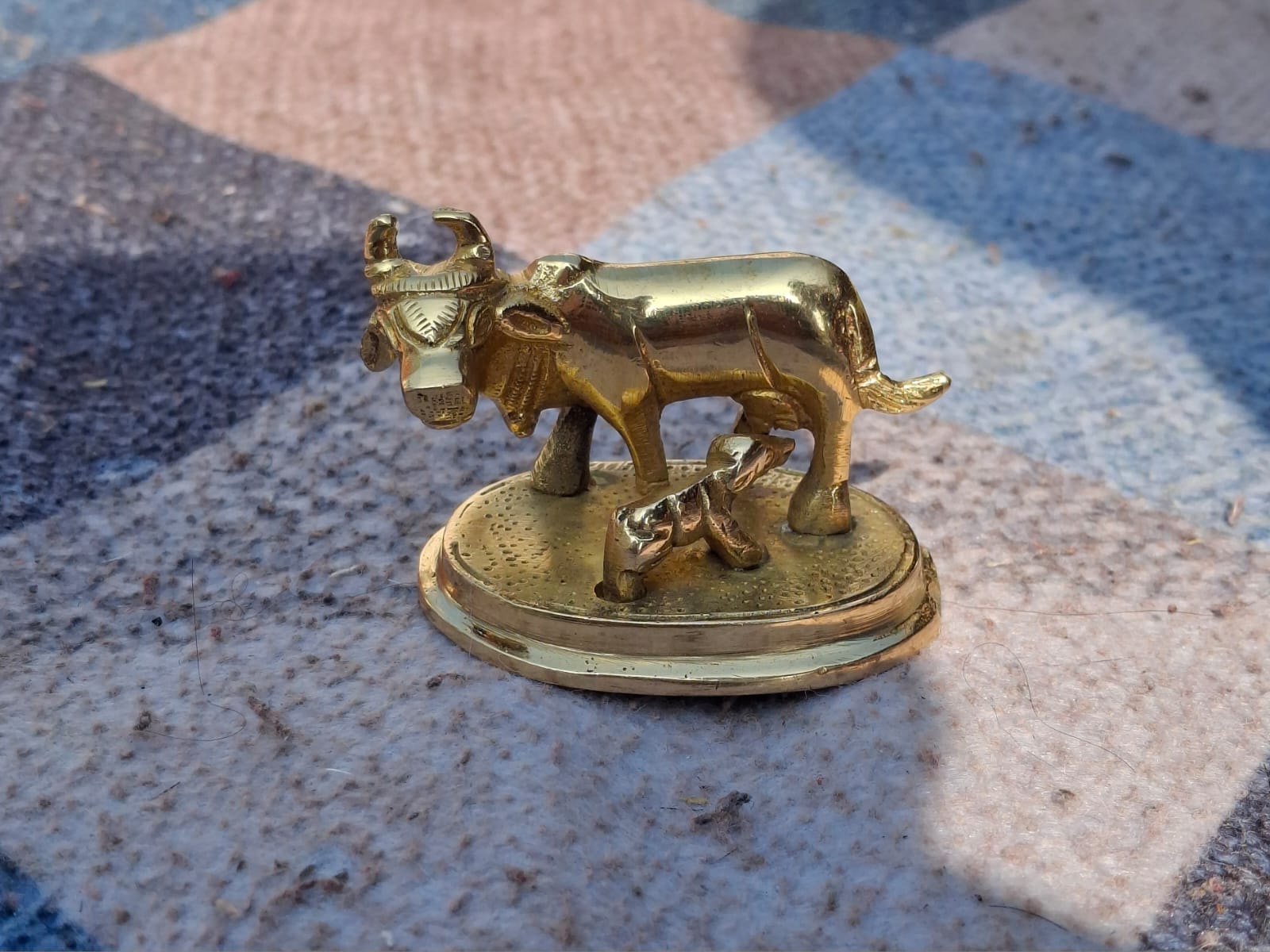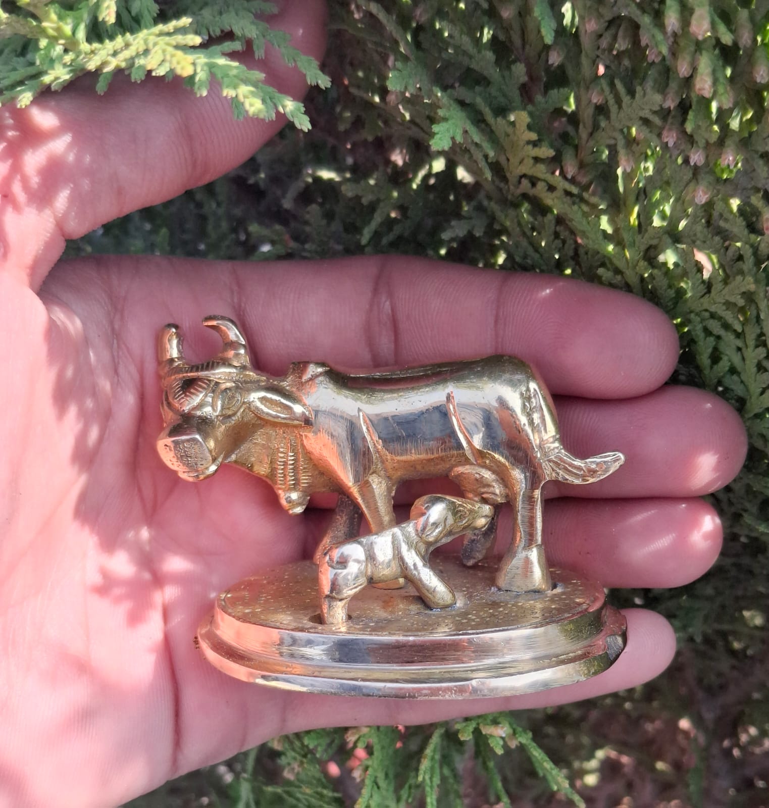 This is a small brass model of a cow with her calf on a round base. It measures about 6 inches in length, 7 inches in breadth, and 1.5 inches in height. The model shows fine detailing on the horns, face, and body. It represents care, protection, and the bond between a mother and child. The brass finish gives it a traditional and decorative look, making it suitable for display as an art piece.